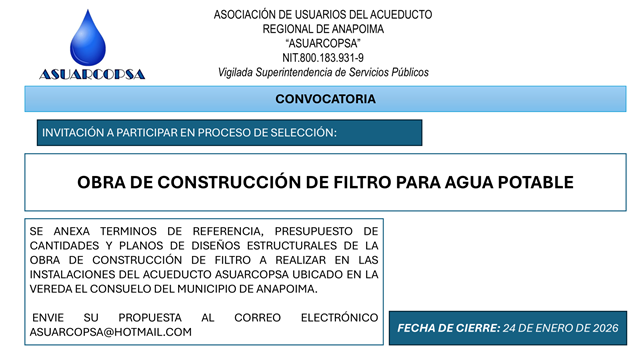 La Junta Directiva de la Asociación de Usuarios del Acueducto Regional de Anapoima ASUARCOPSA, informa a todos sus suscriptores, que en cumplimiento del artículo 140 de la Ley 142 de 1994, y por decisión de la Junta Directiva, el acueducto realizará la suspensión del servicio de acueducto a los suscriptores que tengan incumplimiento frente al contrato de condiciones uniformes por mora en el pago del servicio de acueducto igual o superior a dos meses vencidos.